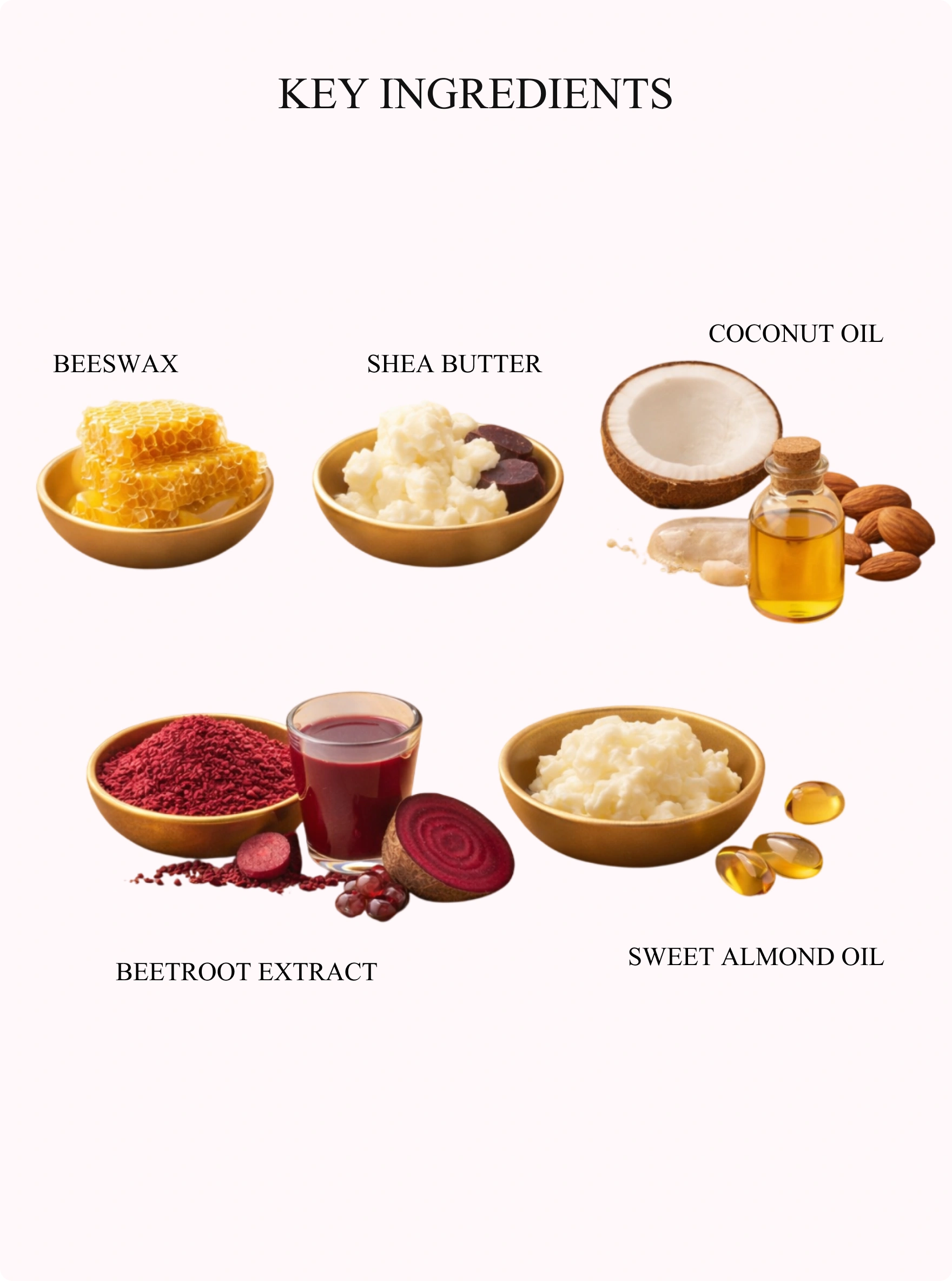Beeswax, Shea Butter / Cocoa Butter, Coconut Oil, Sweet Almond Oil, Beetroot Extract / Beetroot Powder (for natural tint), Vitamin E