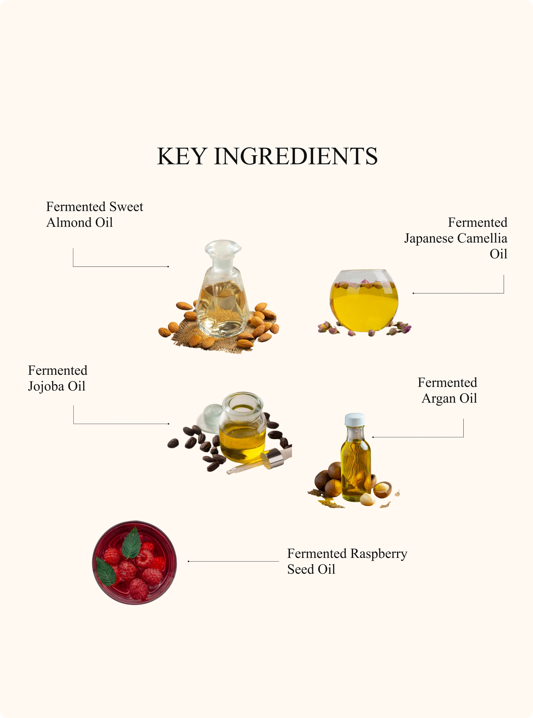 Fermented sweet almond oil, fermented argan oil, fermented japanese camellia oil, fermented camellia oil, fermented olive oil, fermented korean angelica root oil, fermented gromwell root oil, fermented jojoba oil, fermented gotu kola oil, fermented raspberry seed oil, fermented coconut oil, Peppermint Oil, Lavender Oil, Cedarwood Oil, Juniper Berry Oil, and Clary Sage Oil are combined with 1% Anagain, 1% Biotin, 1% Ceramide, 1% Marine Squalane, 1% Onion Ferment, and 1% Alpha Bisabolol, with a base of 90% Rosemary Oleoresin.
