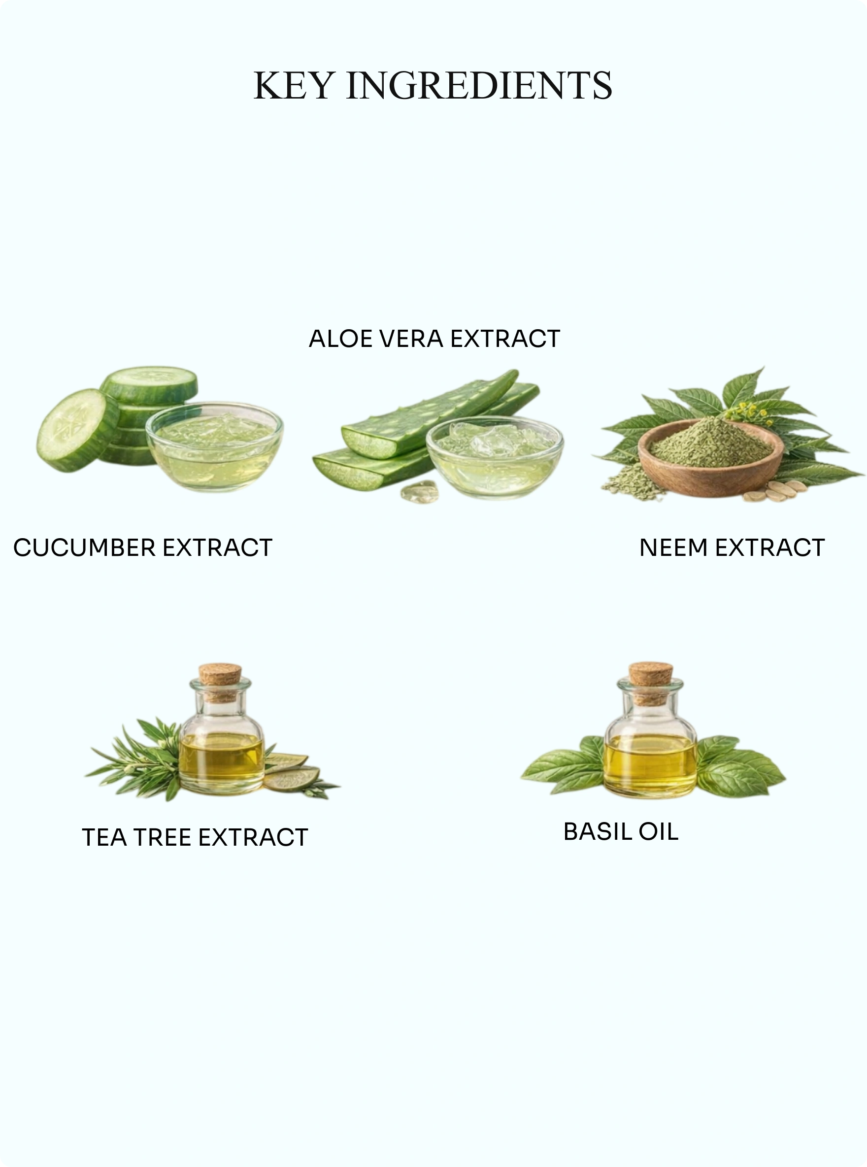 Cucumber Extract, Aloe Vera Extract, Neem, Lemon, Papaya, Orange, Tea Tree, Basil Oil, Fruit Extract.