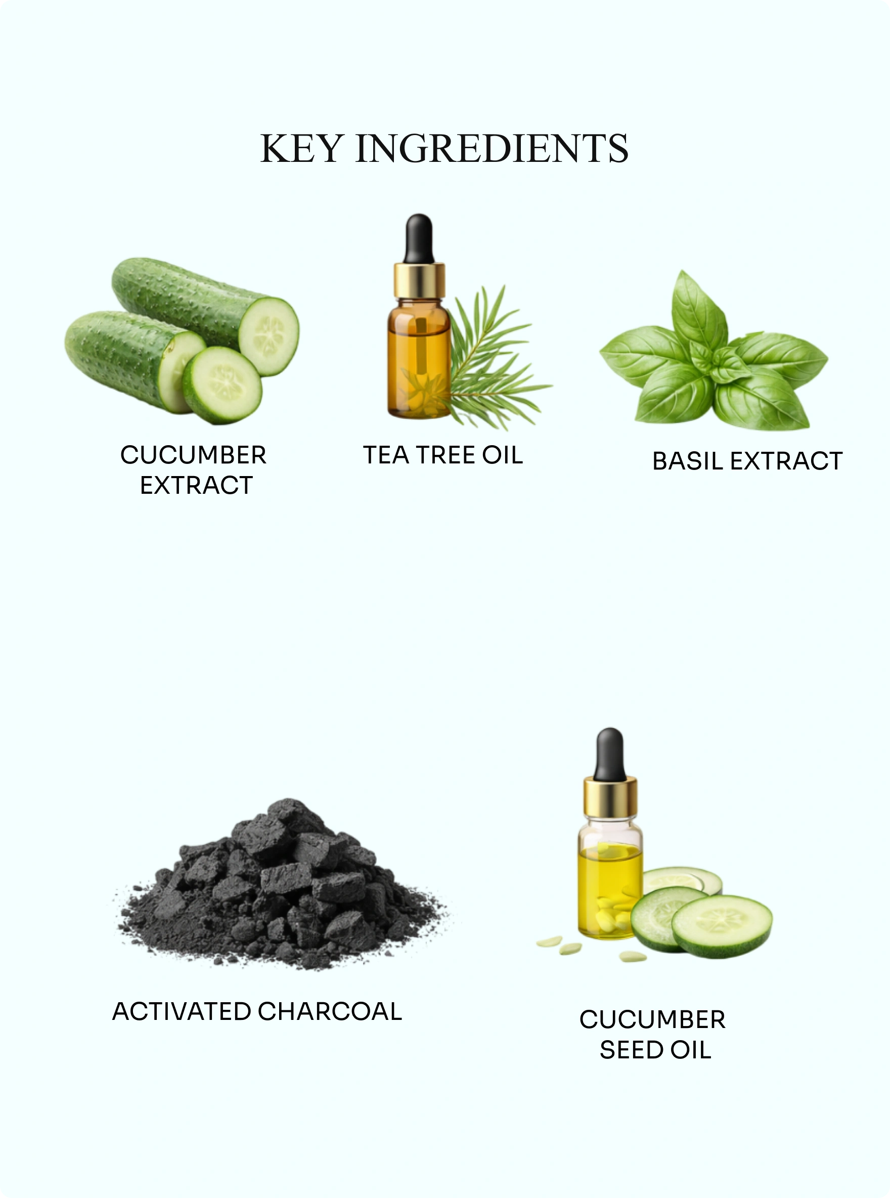 Cucumber Tea Tree Basil Facewash with Tea Goodness of Cucumber Hydrosol, Tea Tree Hydrosol, Basil Extract, Cucumber Seed Oil, Basil Oil, Tea Tree Oil Charcoal.