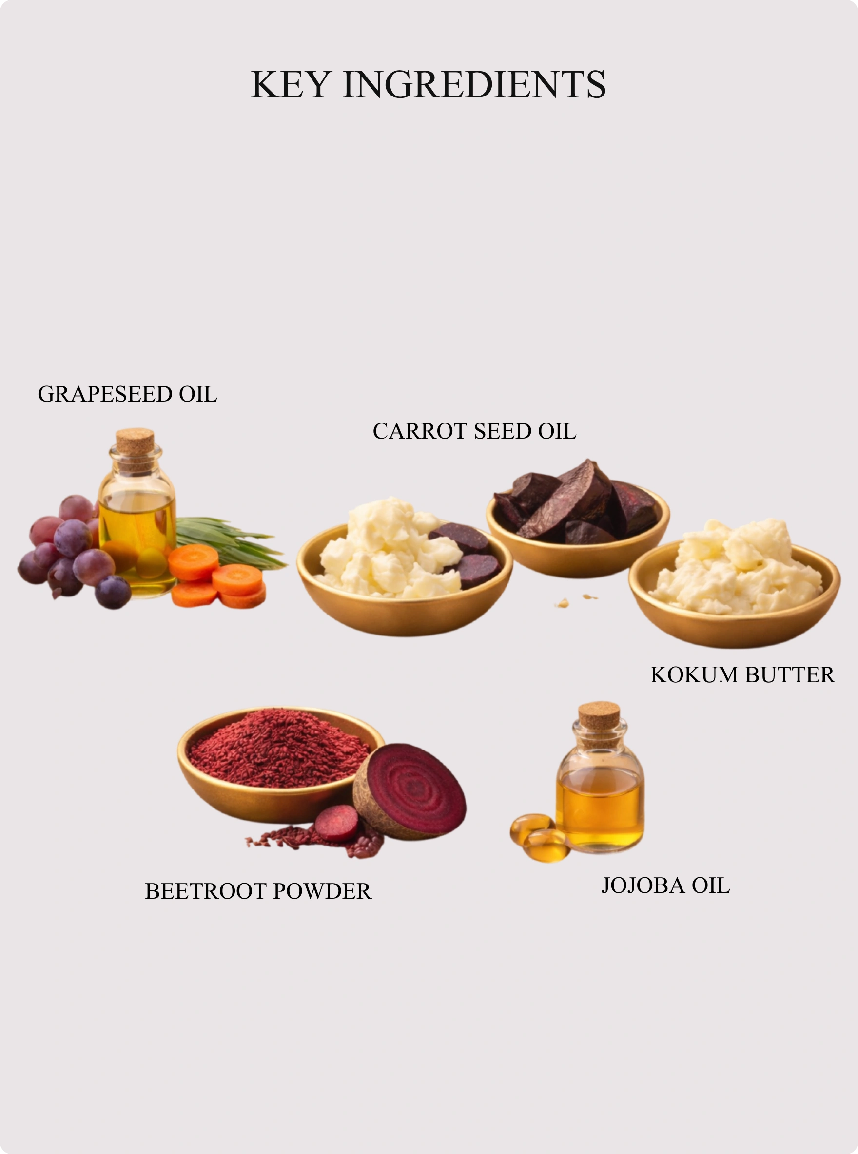 Grapeseed oil, carrot seed oil, vitamin E oil, natural mica, kokum butter, beet root powder, candelilla wax, and jojoba oil.
