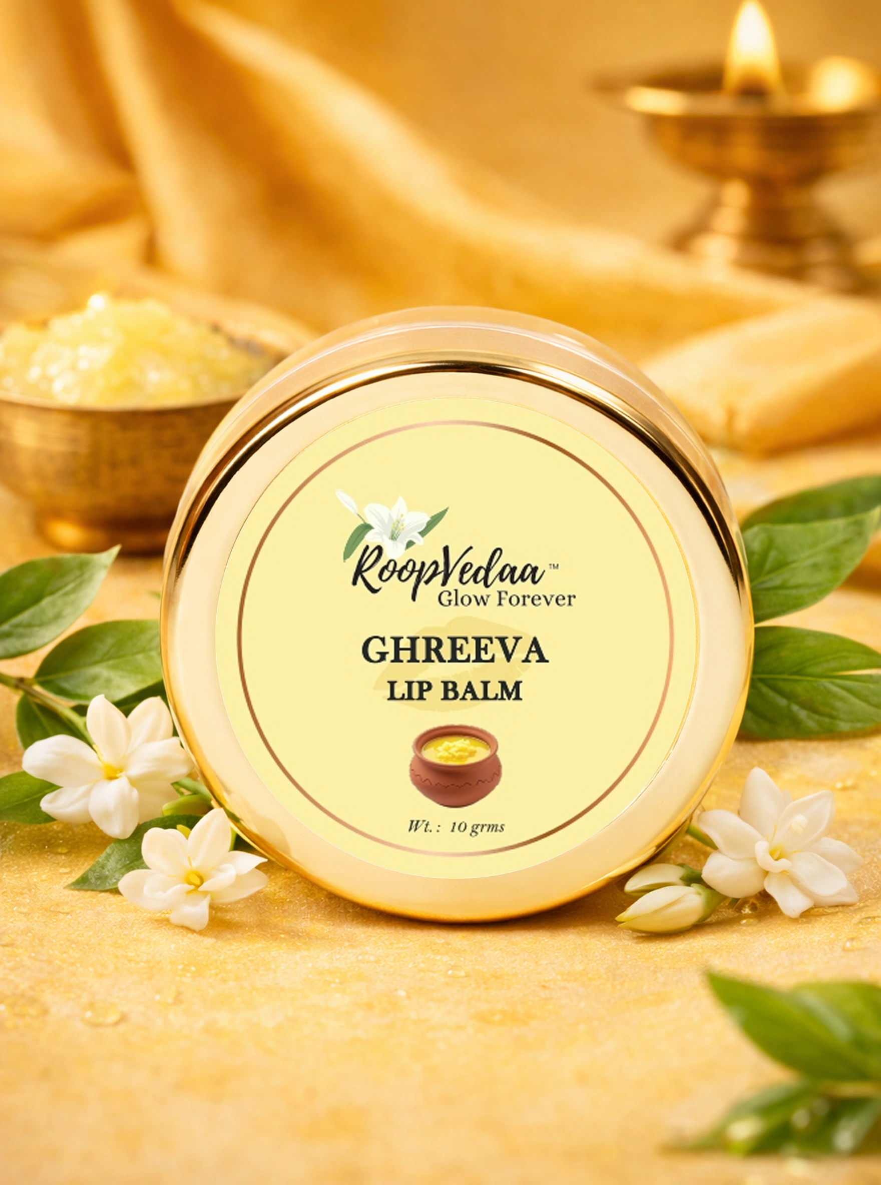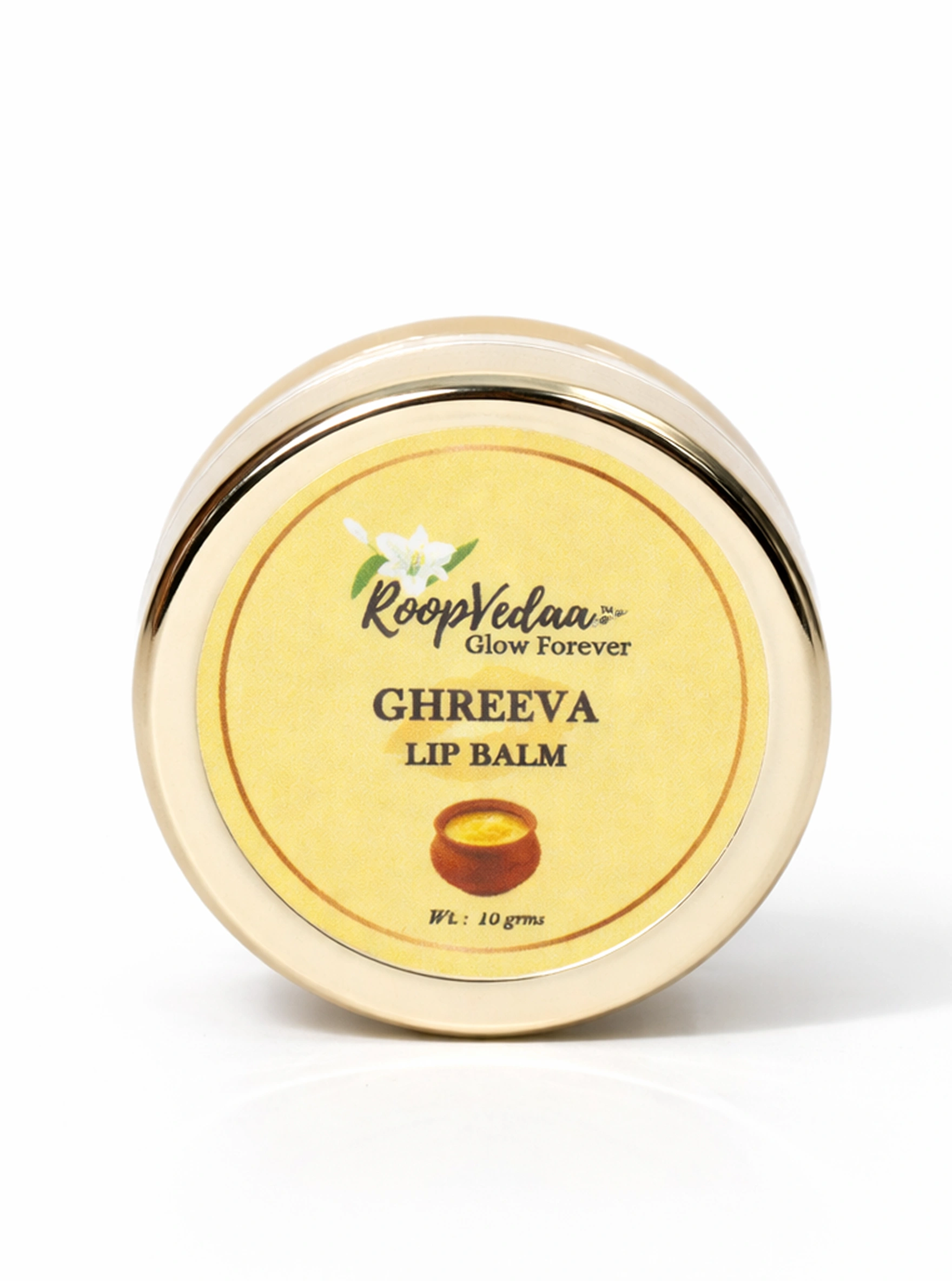 Ghreeva Lip Balm is a richly nourishing lip balm formulated to deeply moisturize, repair, and protect dry, damaged lips. Powered with traditional Pure Ghee (Clarified Butter), Shea/Cocoa Butter, Coconut Oil, Sweet Almond Oil, and Vitamin E, it delivers intense hydration, helps heal cracked lips, and restores smoothness. The luxurious, buttery texture forms a protective barrier against dryness, environmental aggressors, and moisture loss, keeping lips soft, supple, and comforted with every application.