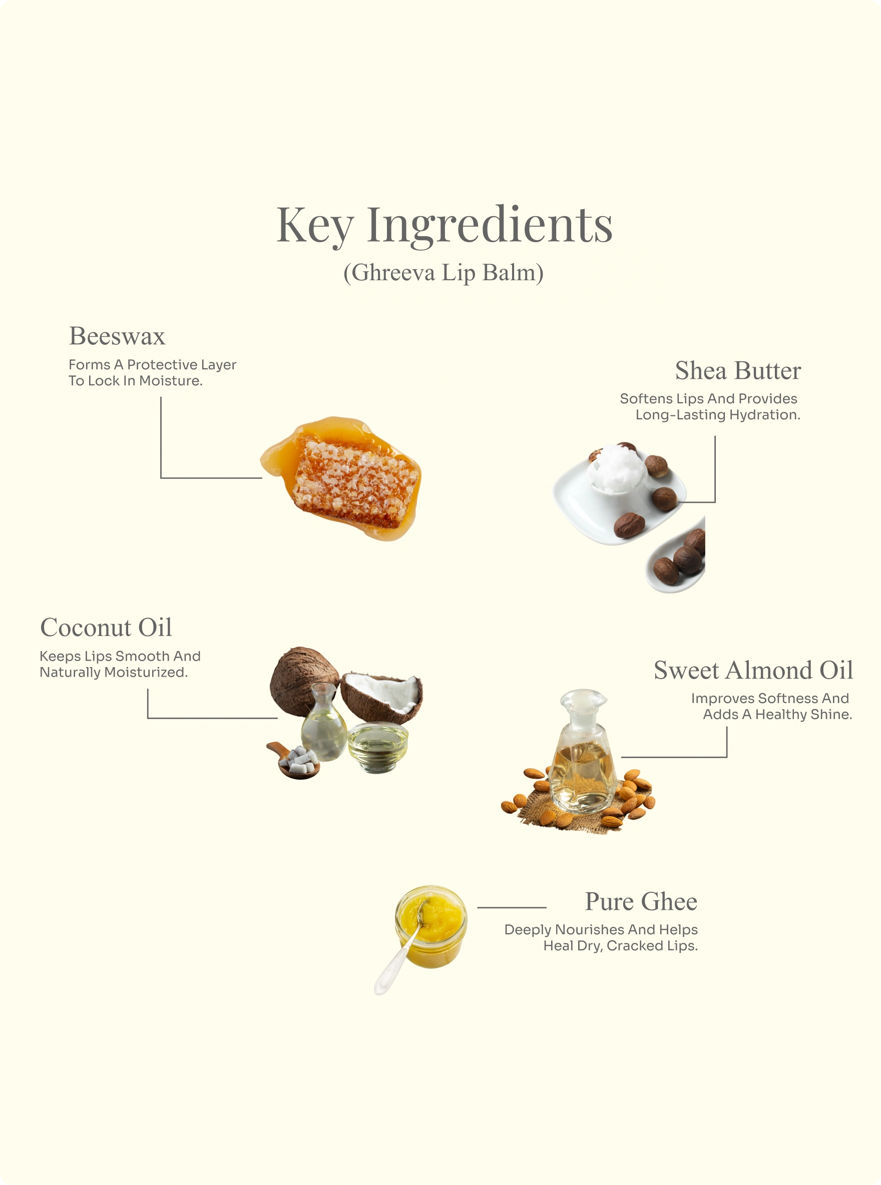 Pure Ghee (Clarified Butter), Beeswax, Shea Butter / Cocoa Butter, Coconut Oil, Sweet Almond Oil, Vitamin E