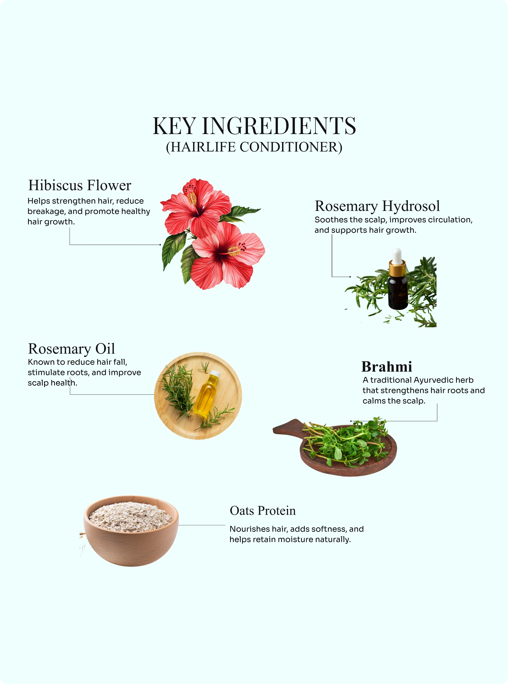 Hairlife Conditioner is a deeply nourishing and restorative conditioner specially crafted for dry, damaged, and chemically treated hair. Enriched with emollient natural oils like Virgin Coconut, Olive, Black Sesame, and herbal infusions of Hibiscus, Rosemary, Brahmi, and Oats Protein, it helps reduce split ends, strengthens hair, and conditions each strand. This conditioner works to repair, smoothen, and hydrate rough hair, enhancing softness, improving manageability, and giving the hair a healthier, lustrous appearance with every use.