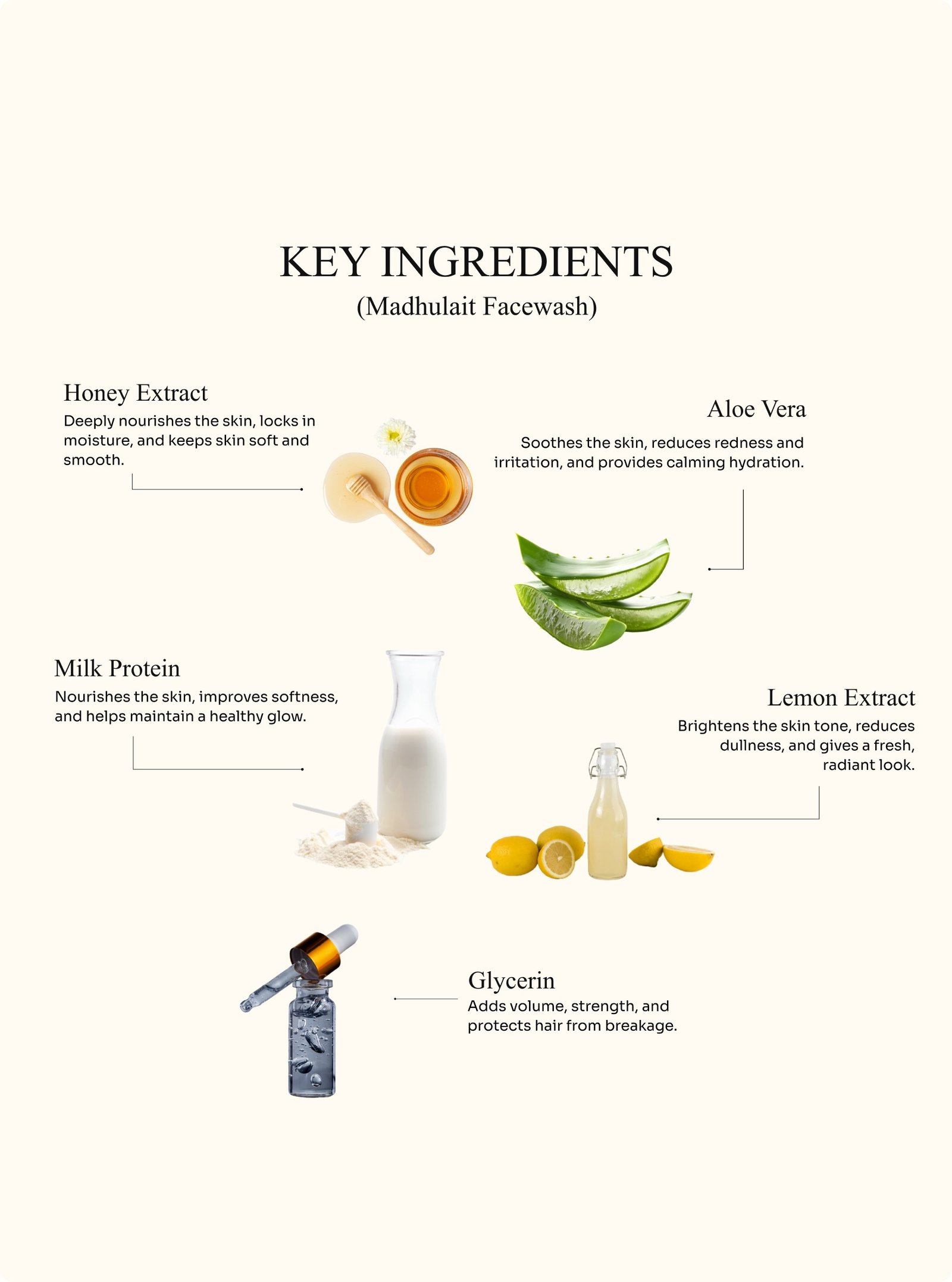 Aqua (Water), Cocamidopropyl Betaine, Decyl Glucoside, Glycerin, Honey Extract, Milk Protein (Lactis Proteinum), Aloe Barbadensis Leaf Extract, Sodium PCA, Panthenol (Vitamin B5), Allantoin, Propylene Glycol, Carbomer, Citric Acid, Sodium Benzoate, Potassium Sorbate, Ethylhexylglycerine, Niacinamide, Hyaluronic Acid, Lemon Extract.