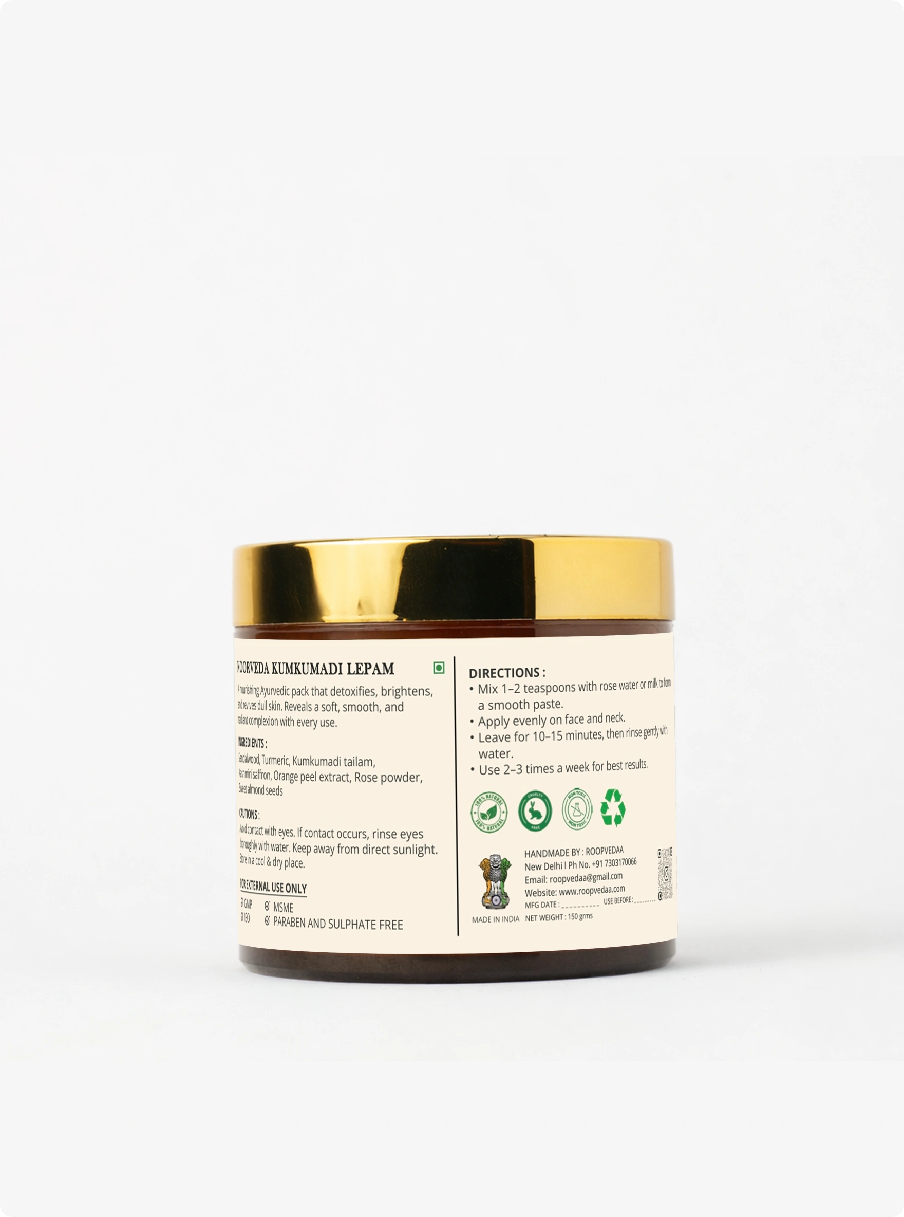 Kumkumadi Lepam is a traditional Ayurvedic face pack formulated to detoxify the skin, enhance natural radiance, and improve overall skin texture. Rooted in classical Ayurvedic wisdom, this lepam works by gently cleansing pores, reducing dullness, and promoting an even-looking complexion with regular use.