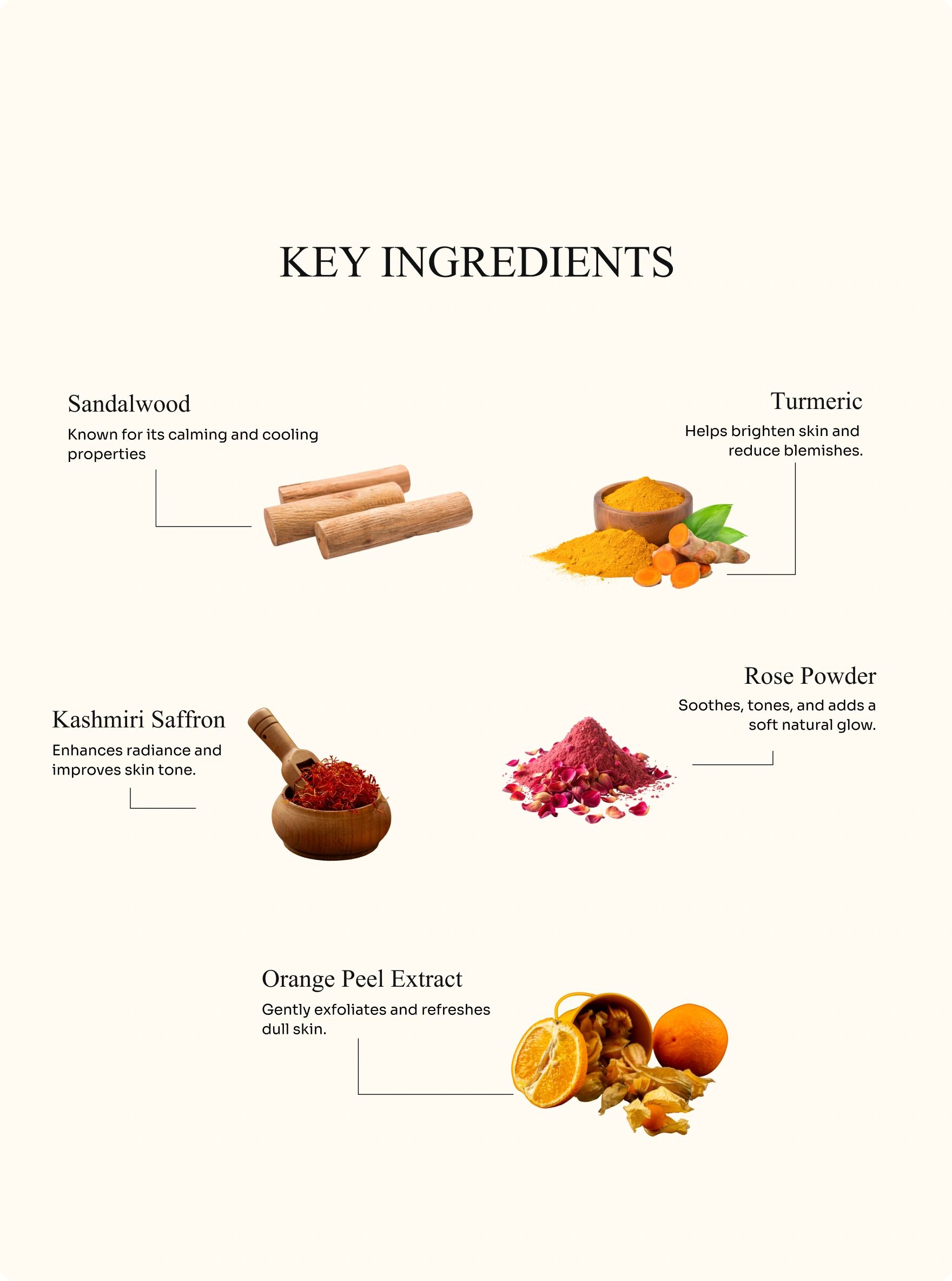 Turmeric, Kumkumadi Tailam, Saffron, Orange Peel Extract, Rose Powder, Sandalwood Powder, Licorice Powder, Rice Flour, Kaolin Natural Flake, Alovera Powder, Hibiscus Flower Powder, Natural Essential Oils.