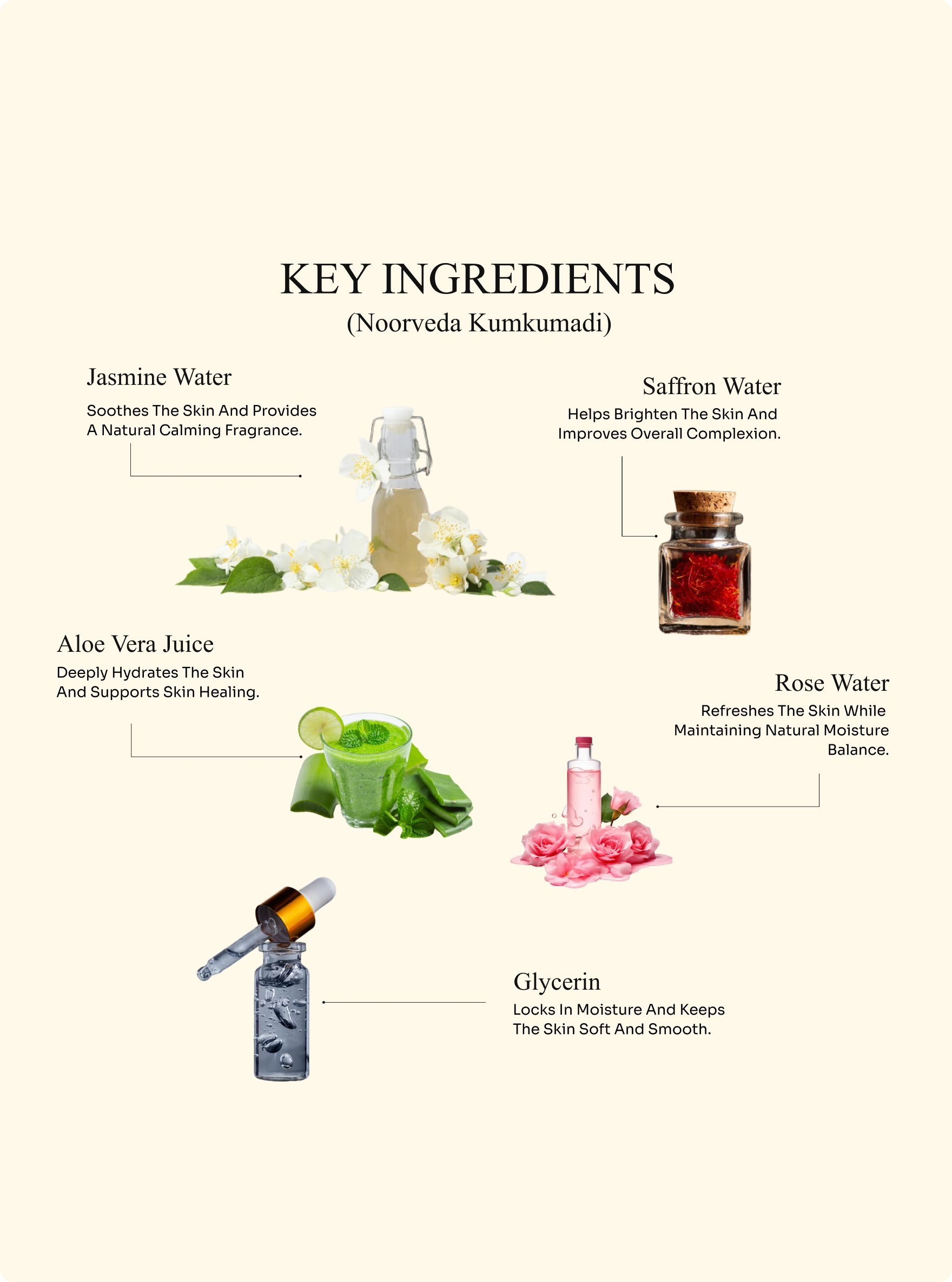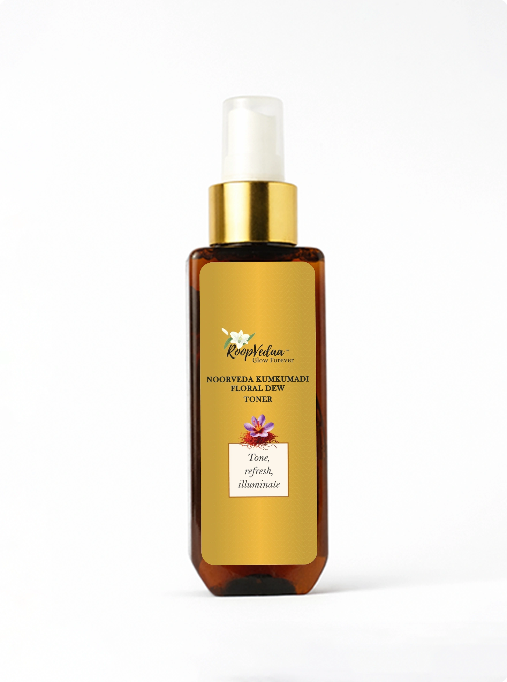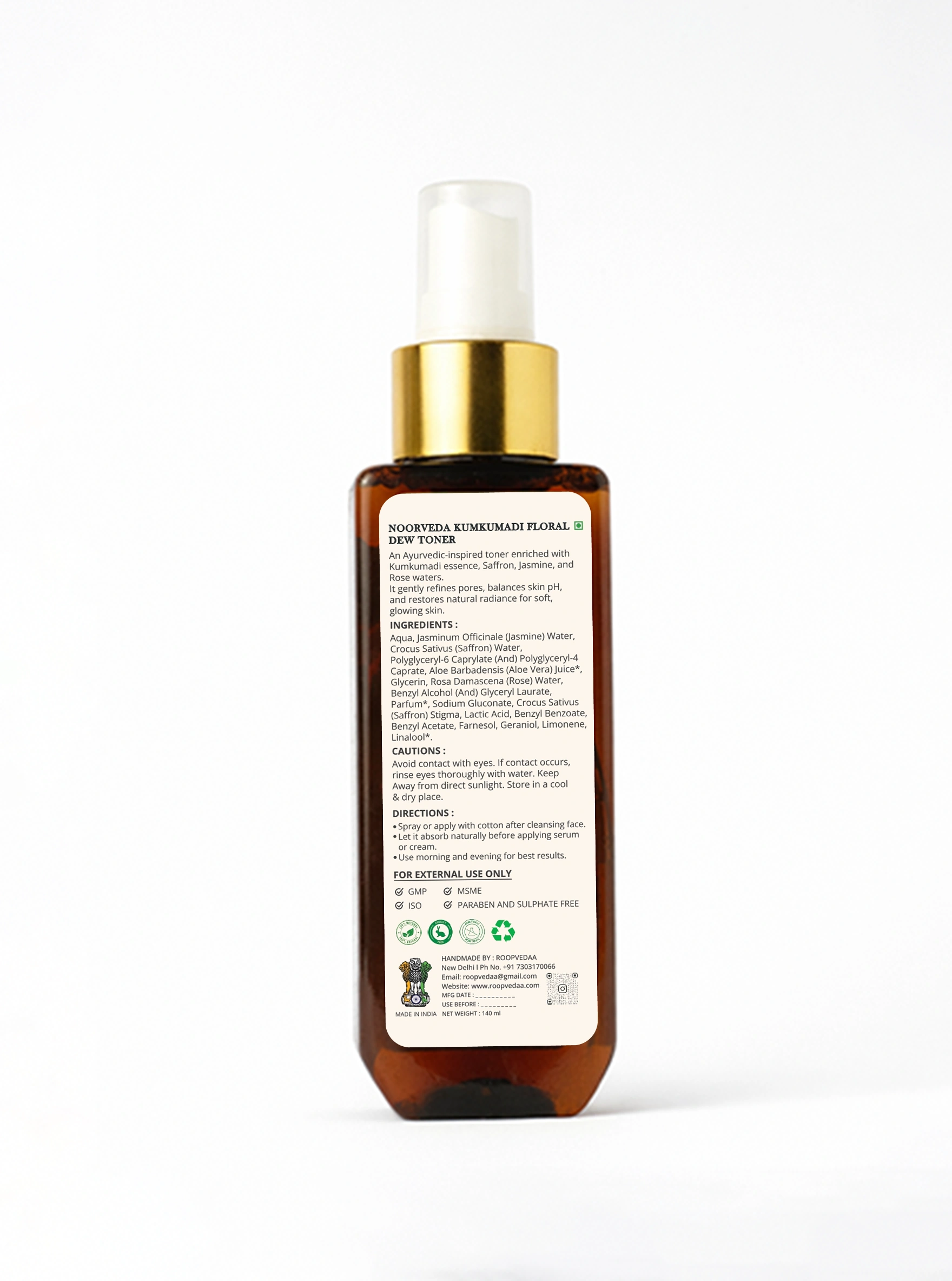 Noorveda Kumkumadi Floral Dew Toner is an Ayurvedic-inspired facial toner crafted to refine pores, balance skin pH, and restore natural radiance. Enriched with the goodness of Kumkumadi essence, Saffron, Jasmine, Aloe Vera, and Rose Water, it helps refresh, hydrate, and tone the skin while imparting a healthy glow. The soothing floral actives calm the skin, reduce dullness, and enhance luminosity, making the skin feel soft, fresh, and revitalized. Free from parabens and sulphates, this toner offers a gentle yet effective toning experience suitable for everyday skincare routines.