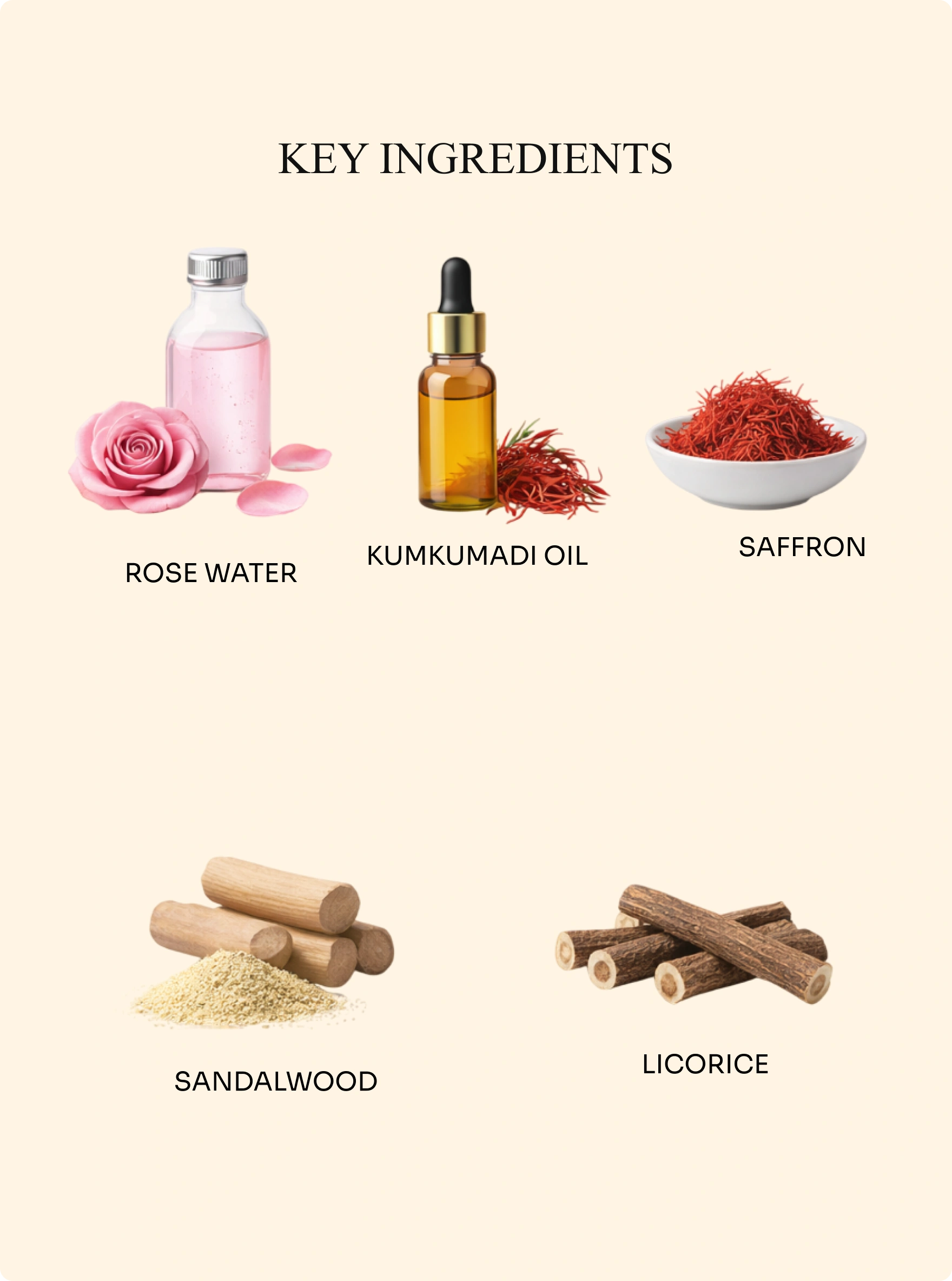 Pure Kumkumadi Oil, Saffron, Sandalwood, Licorice, Aloe Barbadensis Leaf Juice, Curcuma Longa Root Extract, Azadirachta Indica Leaf Extract, Sesamum Indicum Seed Oil, Glycyrrhiza Glabra Root Extract