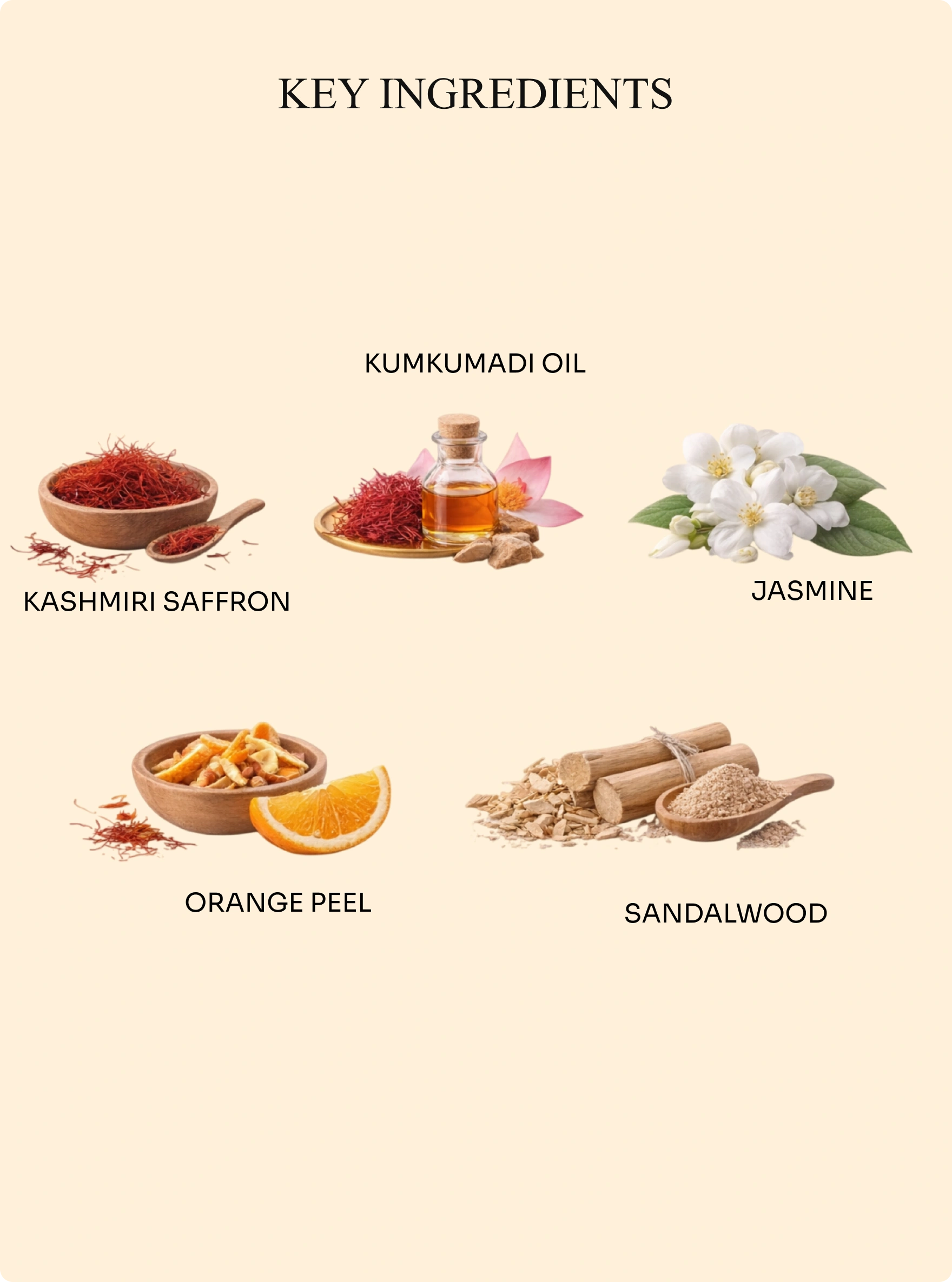 Kashmiri saffron, kumkumadi oil, jasmine, carrot, orange peel, sandalwood, and kumkumadi tailum.