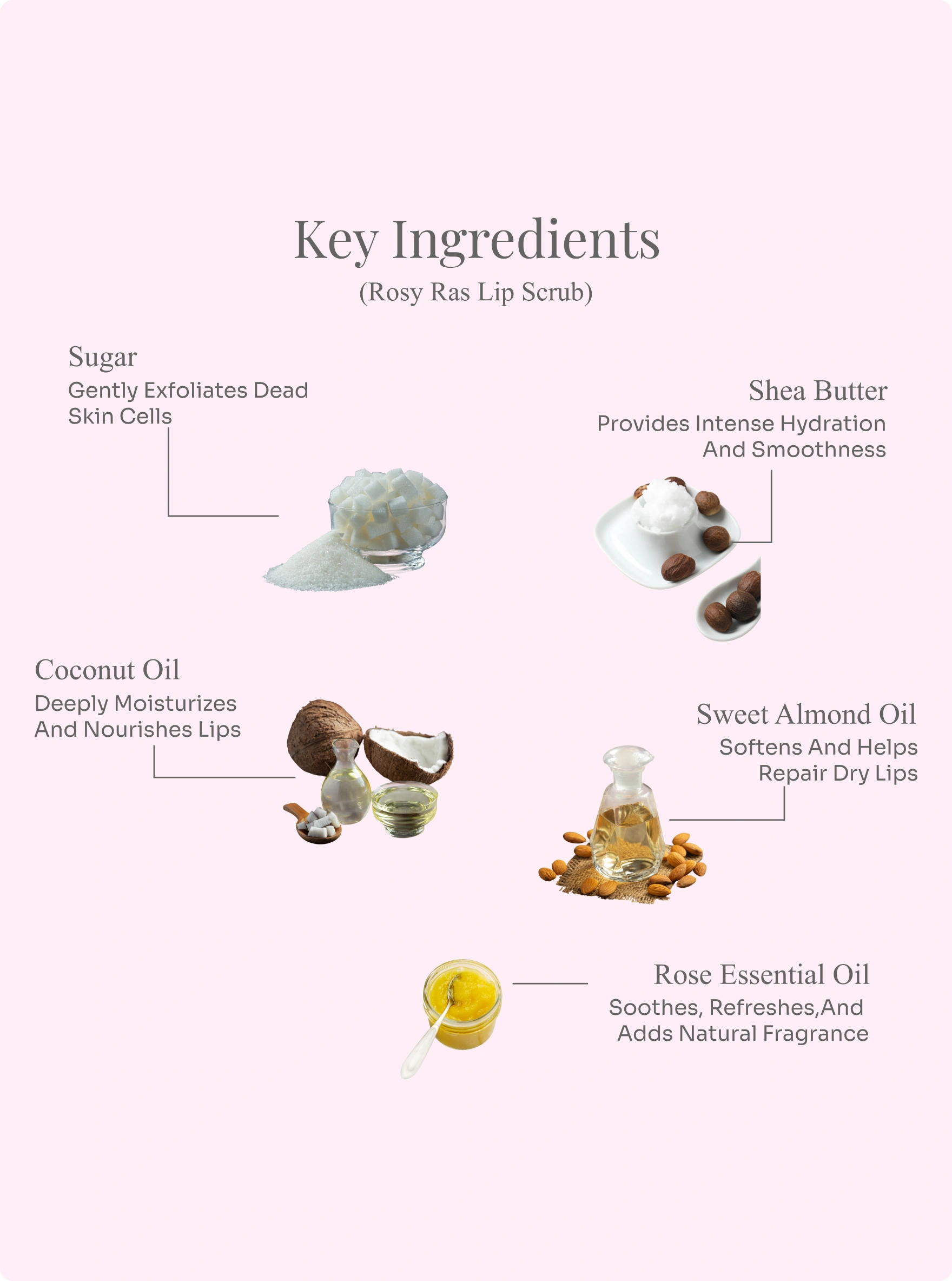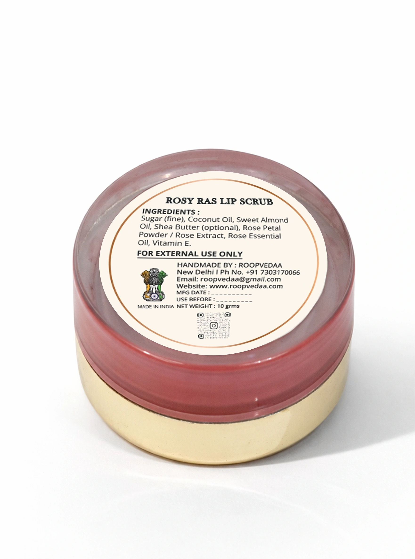 Rosy Ras Lip Scrub is a gentle yet effective exfoliating lip treatment designed to remove dead skin, smooth rough texture, and revive dull, flaky lips. Enriched with fine Sugar grains, nourishing Coconut Oil, Sweet Almond Oil, optional Shea Butter, and soothing Rose extracts and essential oil, it helps polish the lips while deeply moisturizing them. With regular use, it supports softer, healthier, and naturally rosy lips, preparing them better for lip balms, lipsticks, and tints.