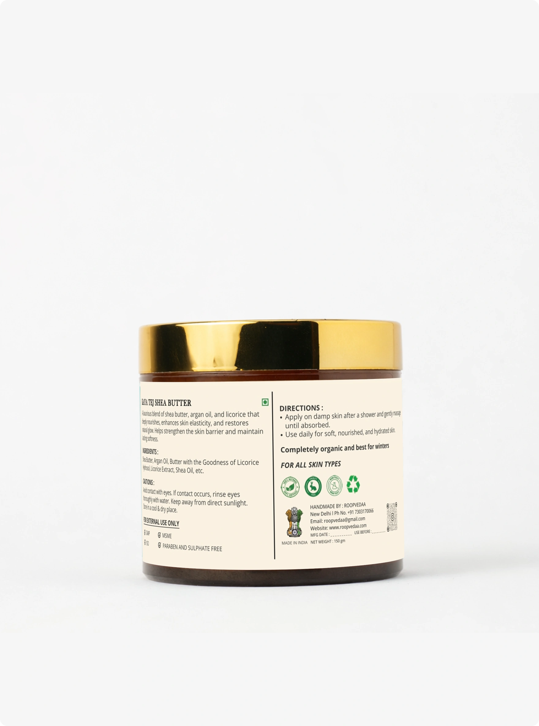 This Shea Butter Body Butter is a deeply nourishing and moisturizing formulation designed to restore skin softness, improve elasticity, and strengthen the skin’s natural barrier. Enriched with rich plant-based oils and herbal extracts, it helps combat dryness, especially during colder months. Regular use leaves the skin soft, supple, hydrated, and well-nourished.