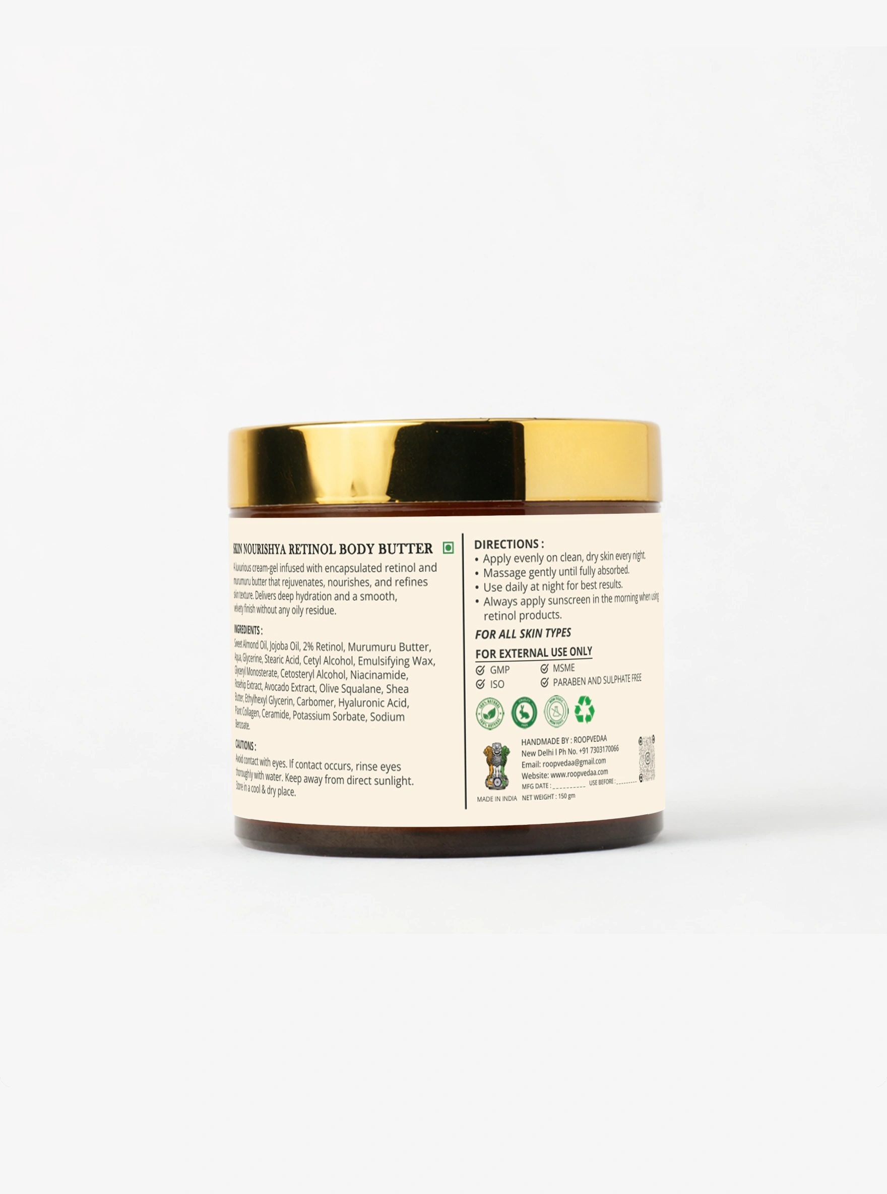 Sweet Almond Oil, Jojoba Oil, 2% Retinol, Murumuru Butter, Aqua, Glycerine, Stearic Acid, Cetyl Alcohol, Emulsifying Wax, Glyceryl Monostearate, Cetostearyl Alcohol, Niacinamide, Rosehip Extract, Avocado Extract, Olive Squalane, Shea Butter, Ethylhexyl Glycerin, Carbomer, Hyaluronic Acid, Plant Collagen, Ceramide, Potassium Sorbate, Sodium Benzoate.