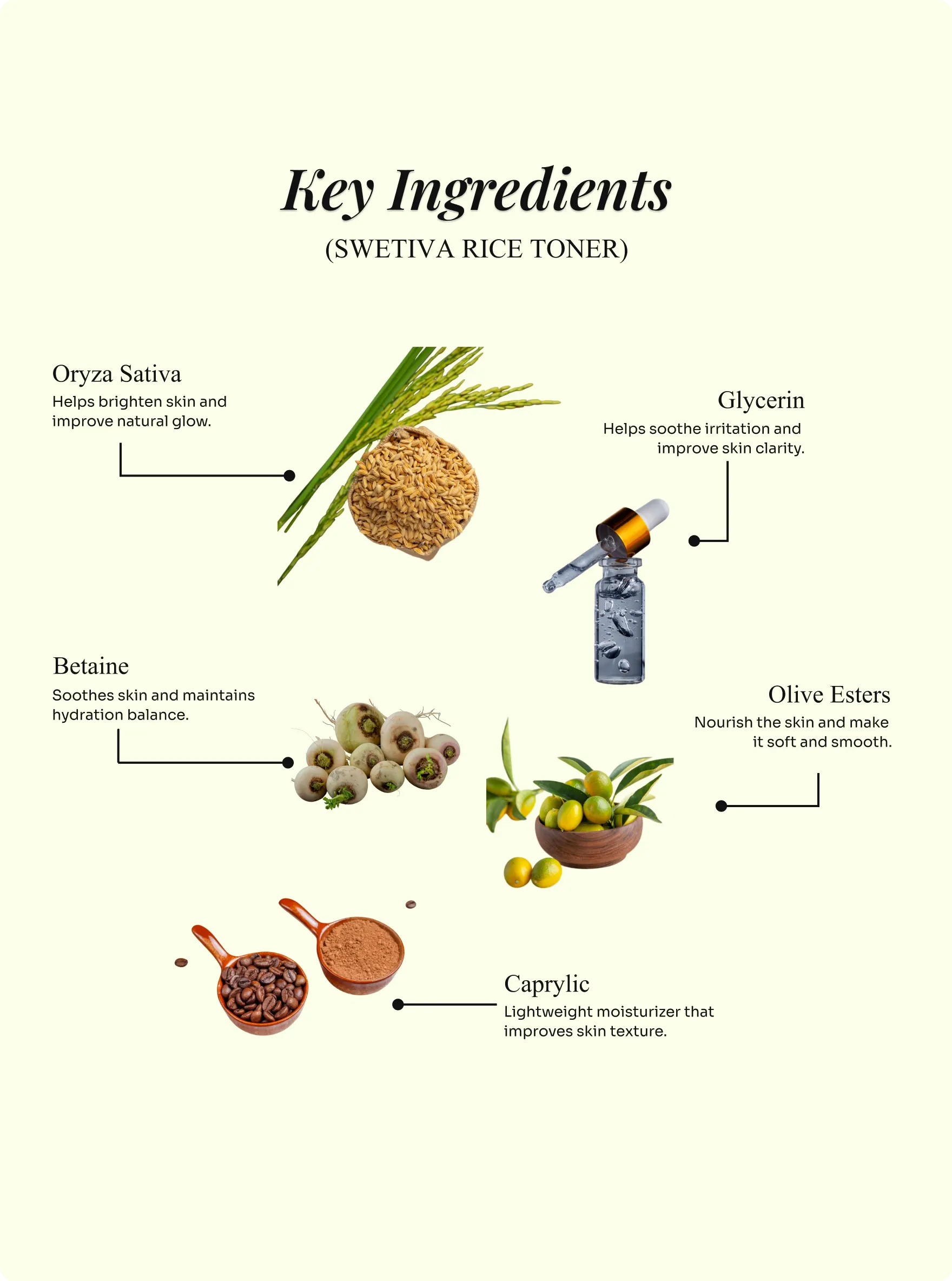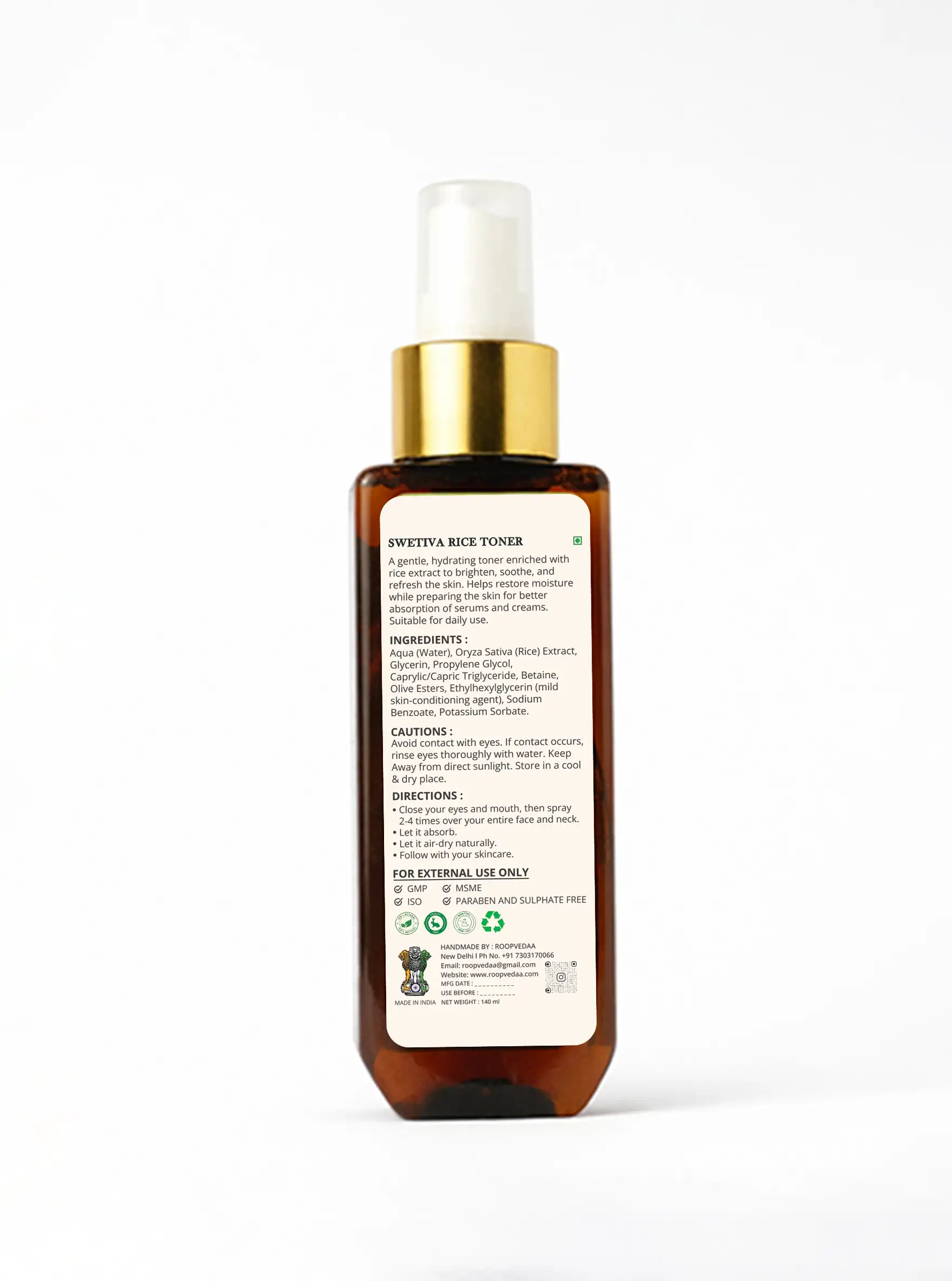 Swetiva Rice Toner is a gentle, hydrating facial toner enriched with rice extract to brighten, soothe, and refresh the skin while restoring essential moisture. Designed to prepare the skin for better absorption of serums and creams, it helps improve skin softness, smoothness, and overall radiance with regular use. Its lightweight, moisture-boosting formula tones the skin without dryness, making the complexion feel calm, balanced, and rejuvenated. Suitable for daily use, it supports healthier-looking skin while maintaining hydration and comfort.