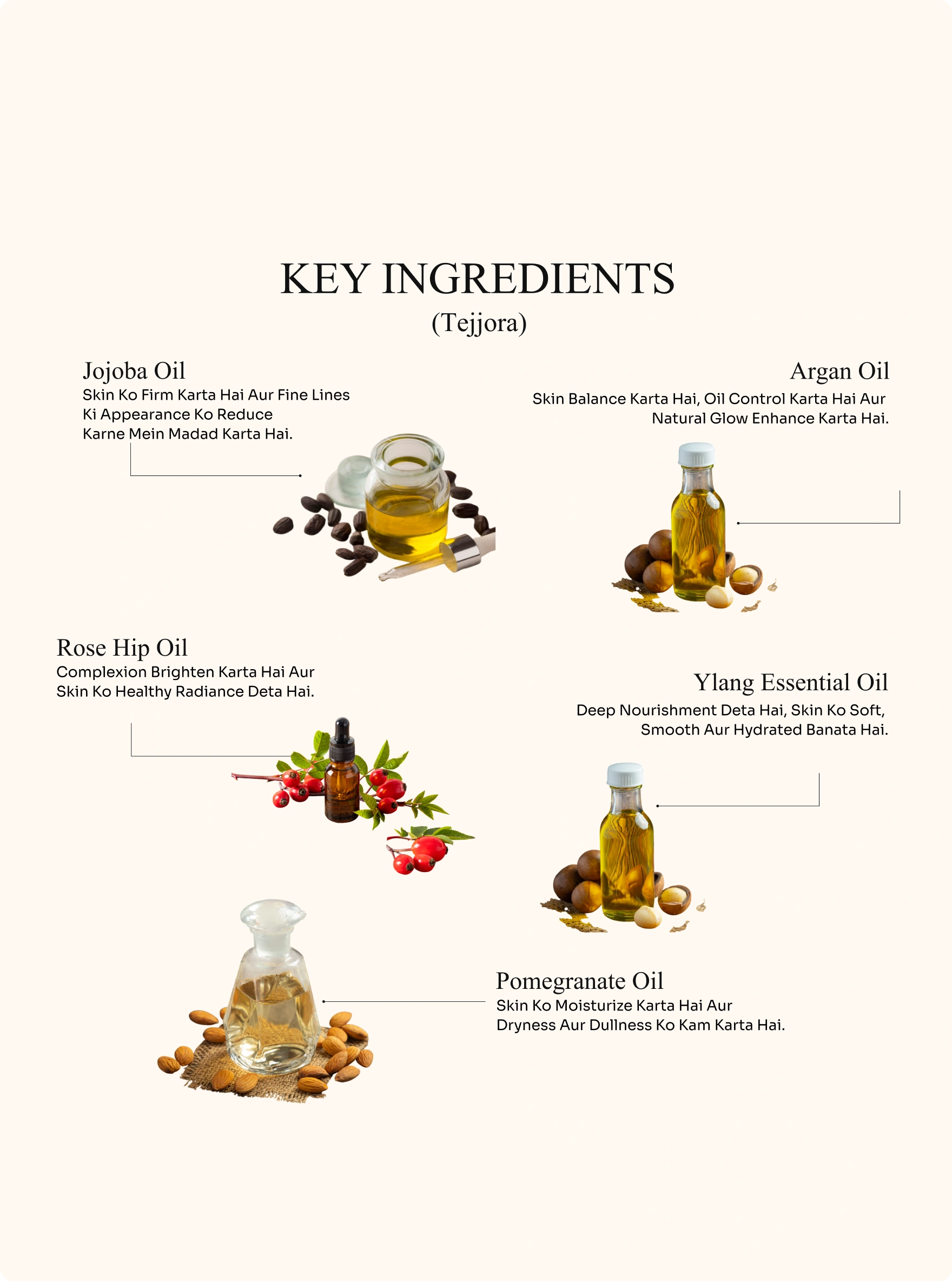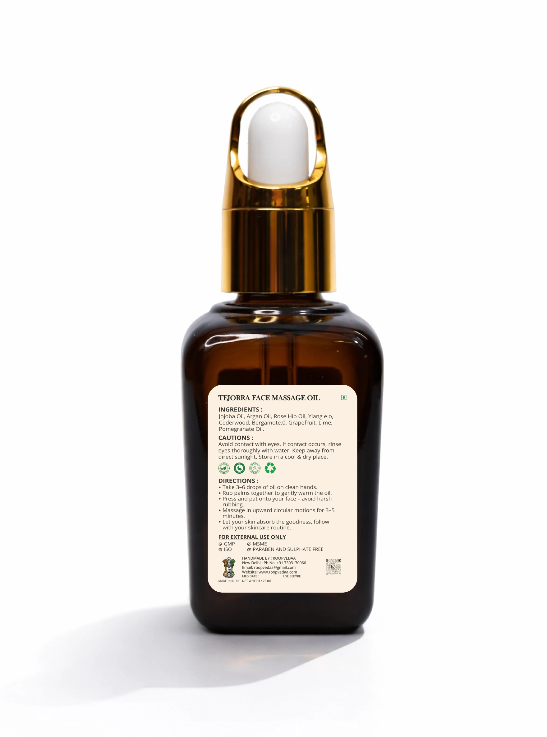 Tejorra Face Massage Oil elevate your skincare ritual with this indulgent, plant-powered face massage oil. Crafted with nourishing botanical oils and potent anti-aging actives, it deeply hydrates, firms, and smooths the skin while enhancing natural radiance. Perfect for daily facial massage, it boosts circulation, reduces fine lines, and leaves your complexion supple, luminous, and glowing with youthful vitality.