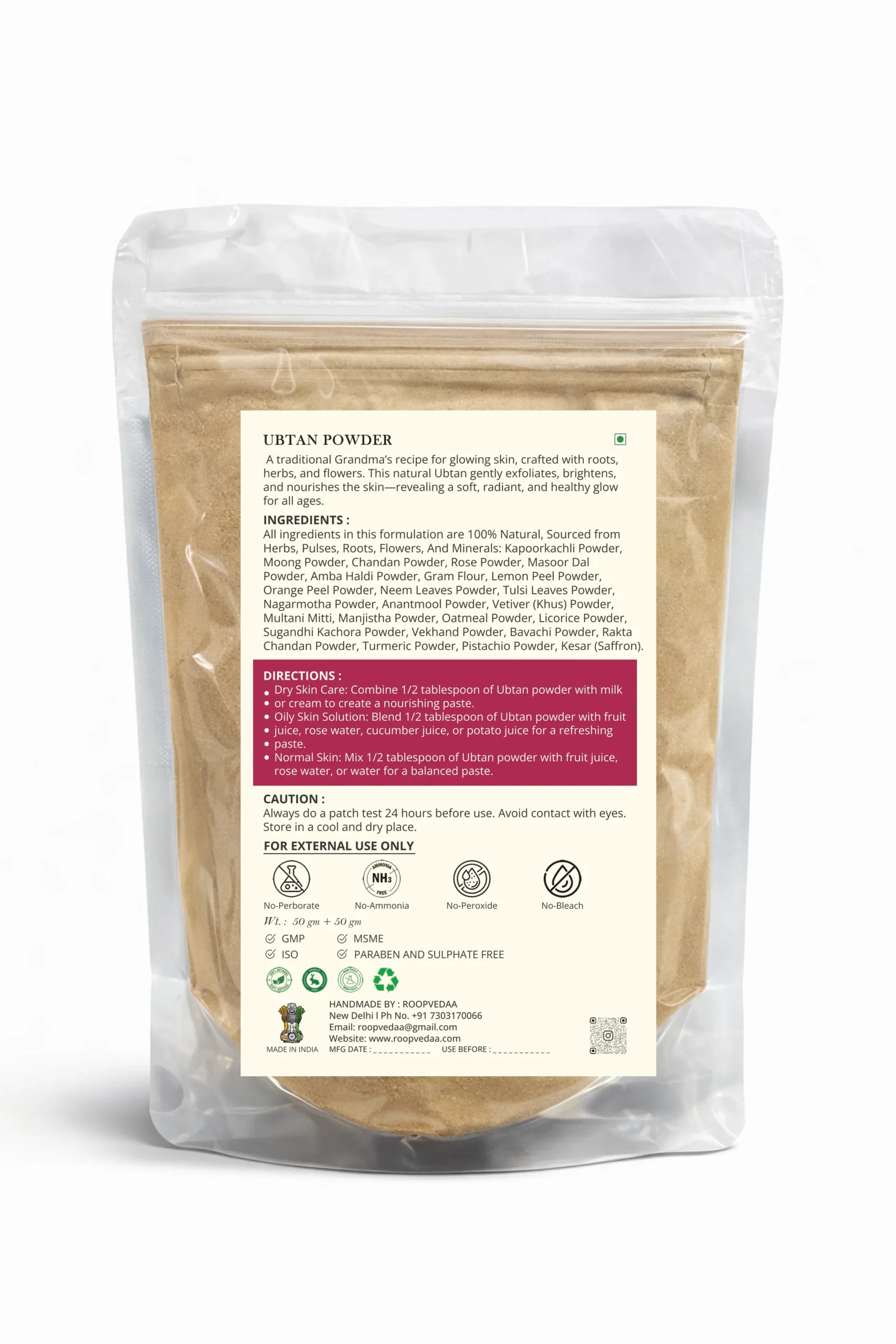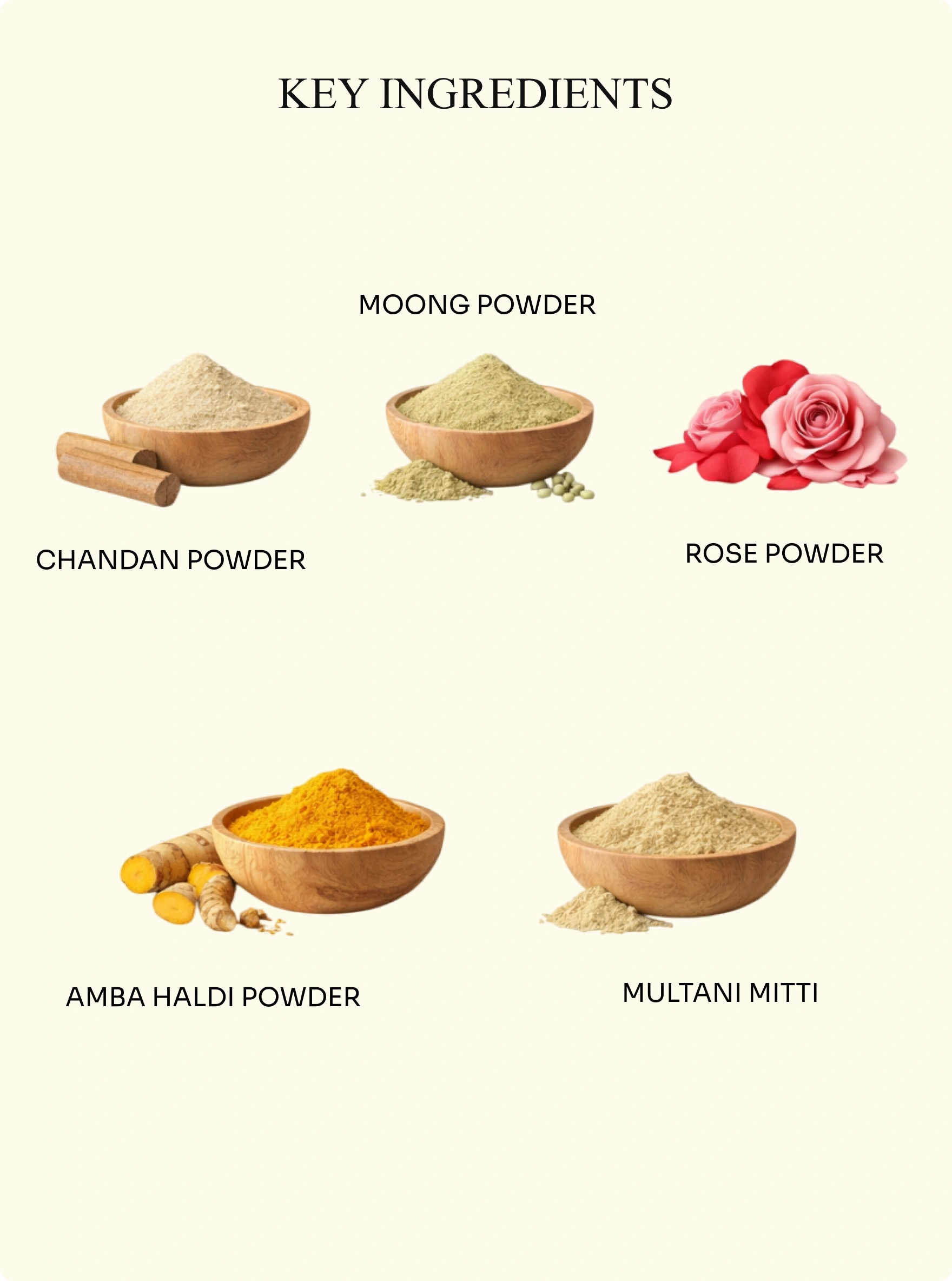 Kapoor Kachli, Moong, Chandan, Rose, Masoor Dal, Amba Haldi, Gram Flour, Lemon Peel, Orange Peel, Neem, Tulsi, Nagarmotha, Anantmool, Vetiver (Khus), Multani Mitti, Manjistha, Oatmeal, Licorice, Sugandhi Kachora, Vekhanda, Bavachi, Rakta Chandan, Turmeric, Pistachio, Kesar (Saffron).